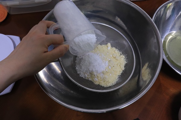 채쳐두었던 아몬드가루와 슈가파우더를 넣습니다!