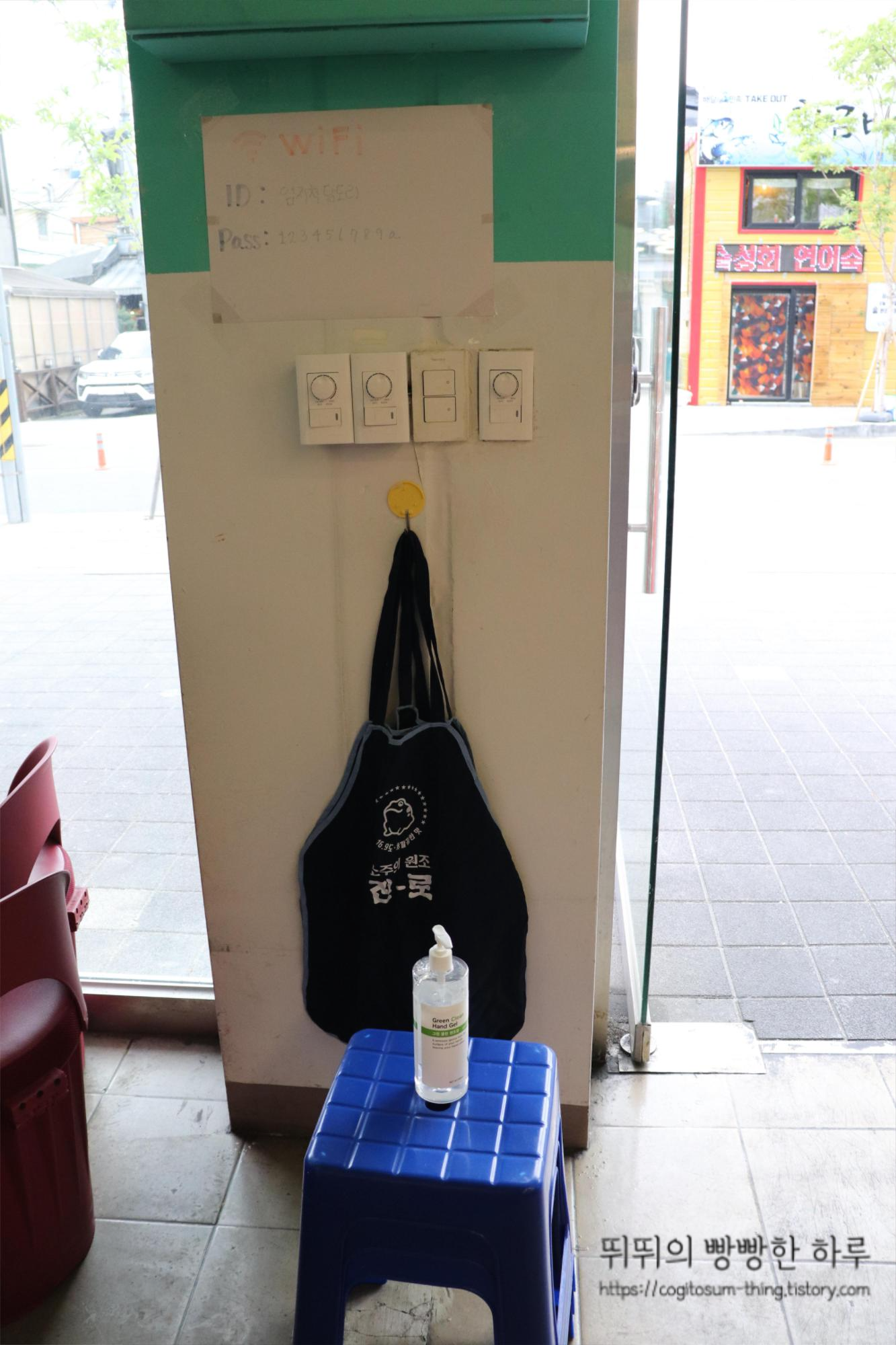 입구 쪽에 앞치마와 소독겔이 비치되어 있습니다