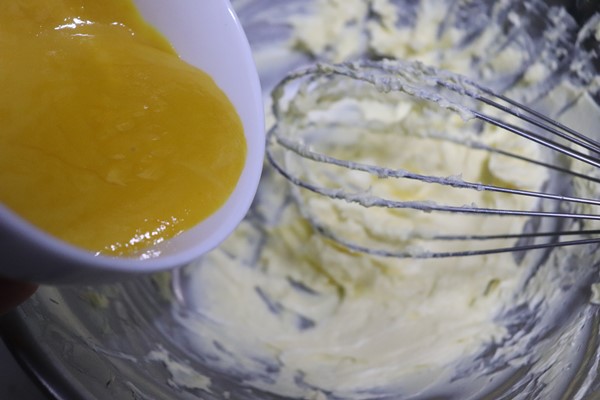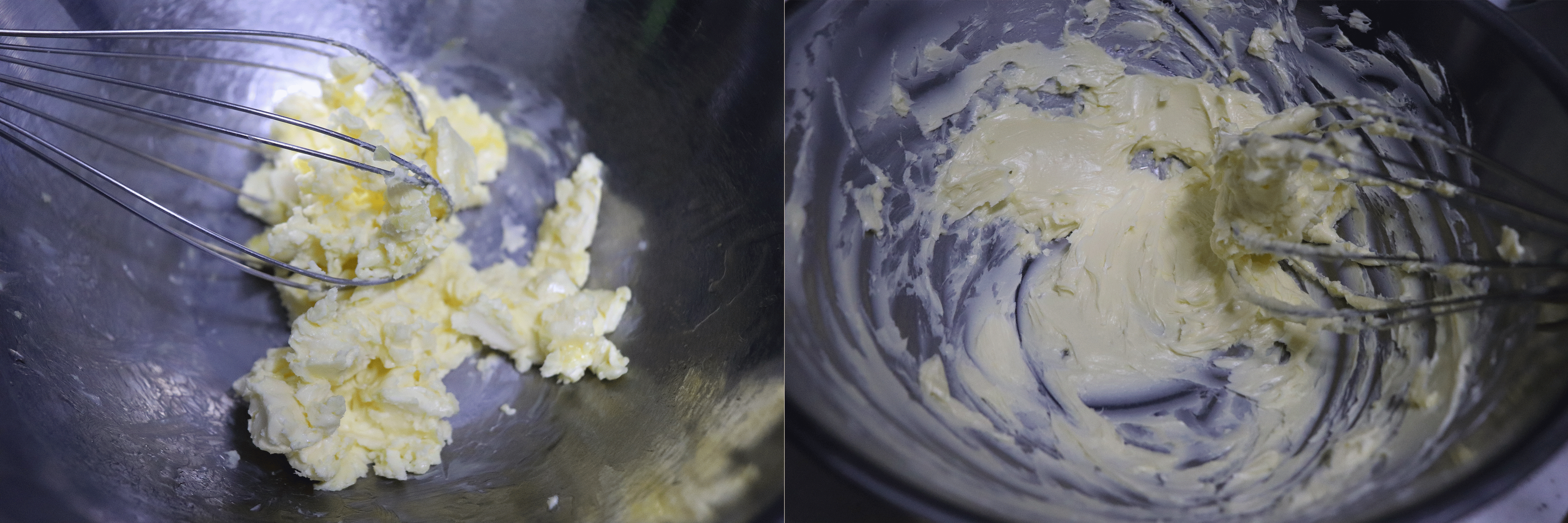 5. 한 김 식힌 커스터드 크림을 풀어준 버터에 조금씩 나눠서 섞어주세요