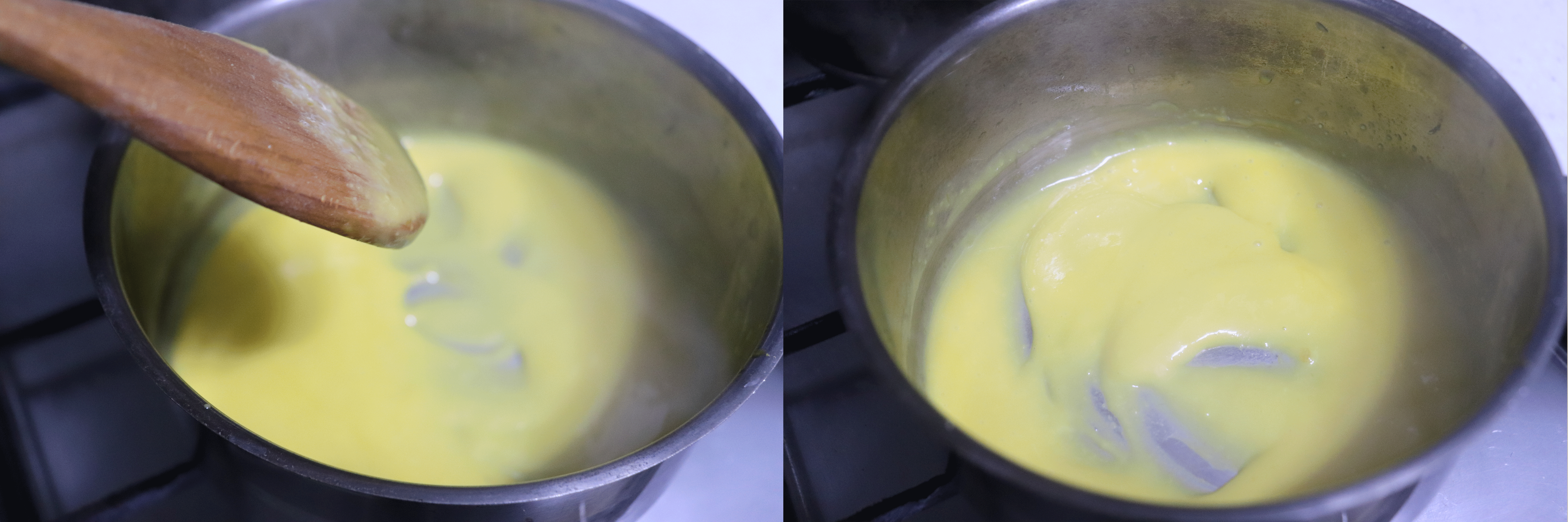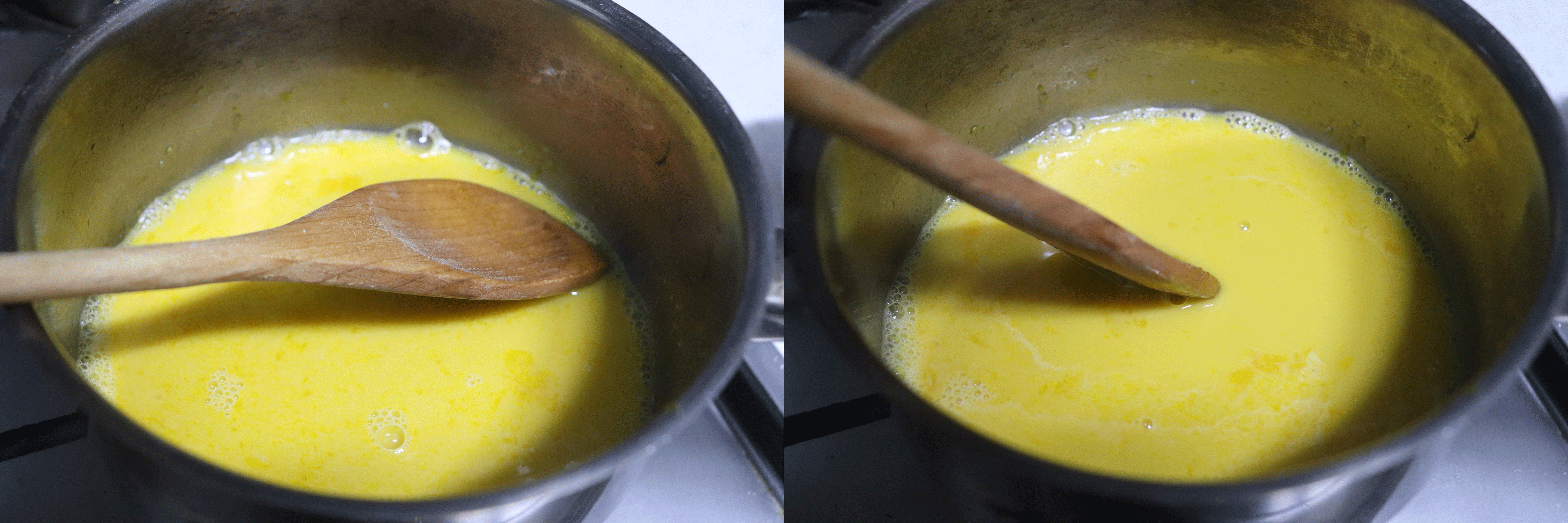 1. 먼저 우유, 노른자, 설탕을 냄비에 넣고 휘휘 잘 섞으며 저어주세요