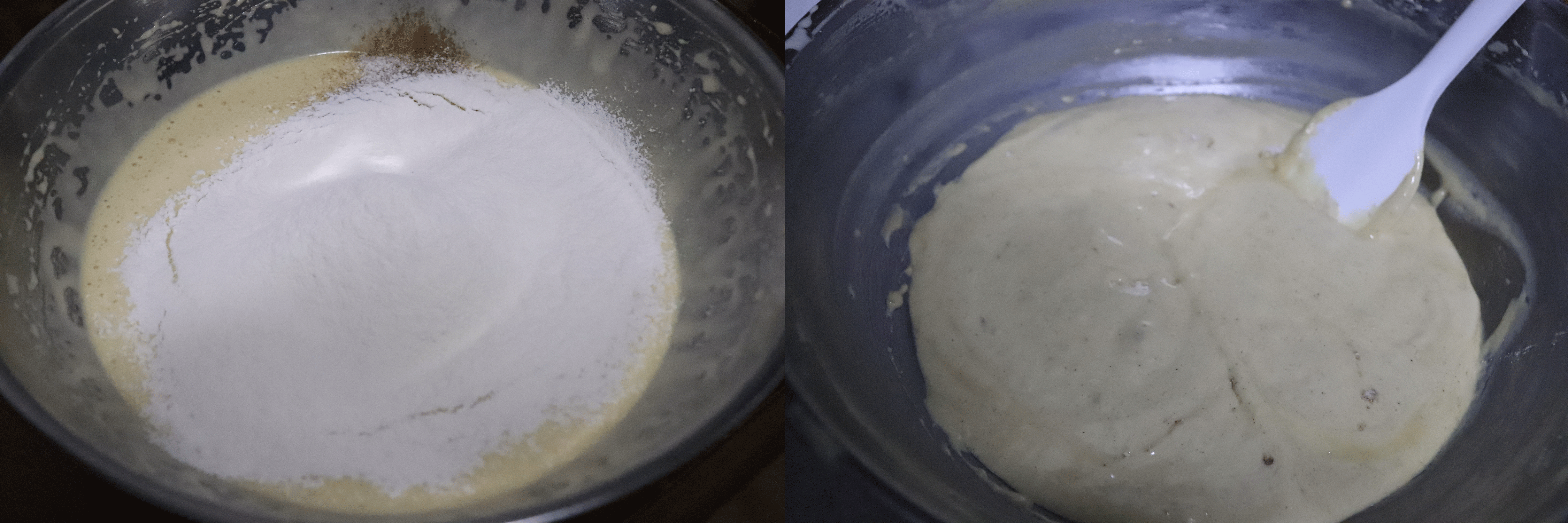 4. 채쳐 놓은 가루도 2번에 넣어 가볍게 j자를 그리며 섞어주세요