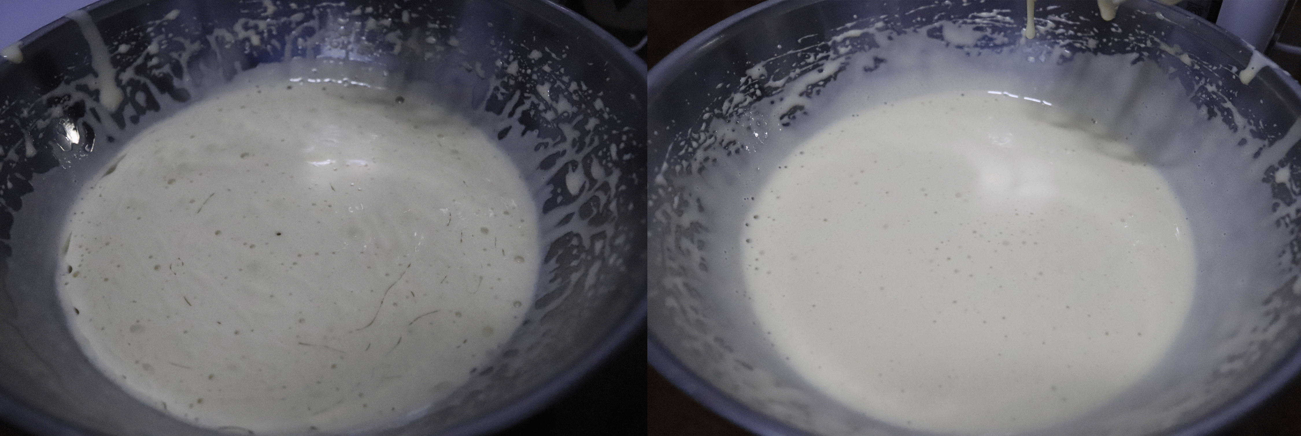 휘핑기로 하얗고 폭신하게 거품이 올라올 때까지 휘핑합니다.