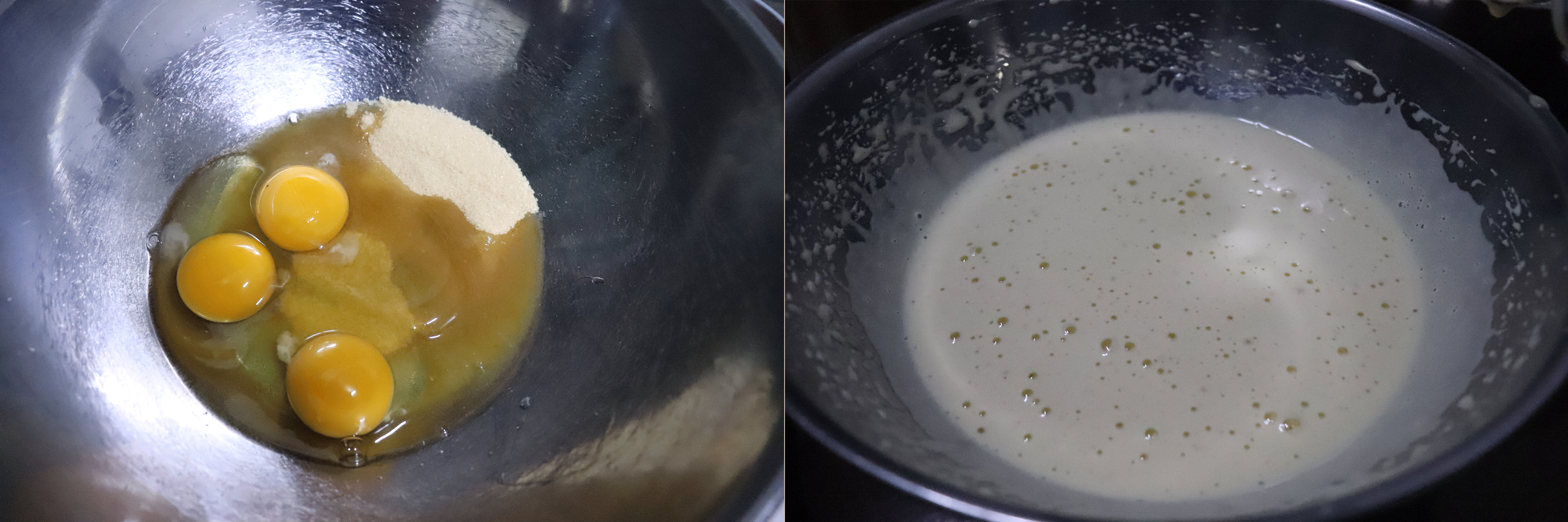2. 계란과 설탕을 흰자 노른자 구분 없이 공립법으로 다 같이 섞을 거예요.